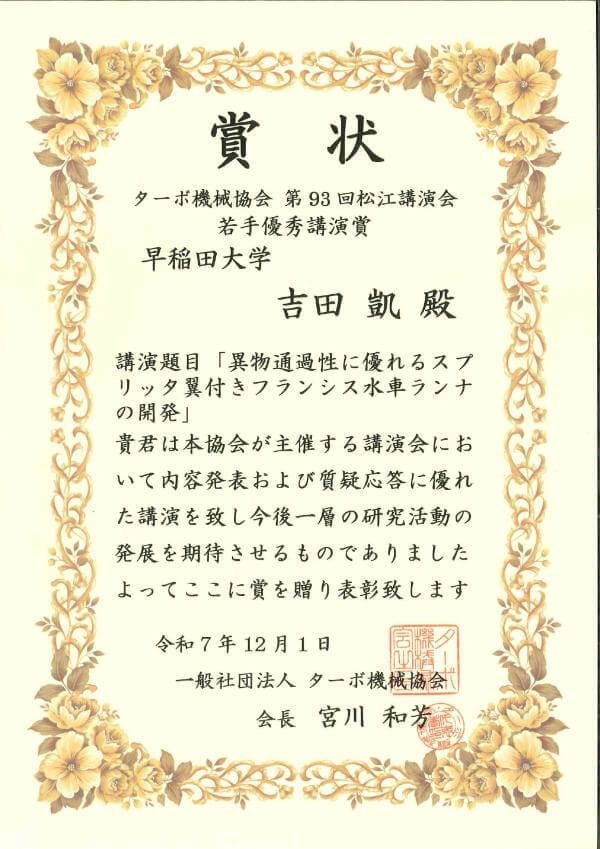 ・吉田 凱 “異物通過性に優れるスプリッタ翼付きフランシス水車ランナの開発”