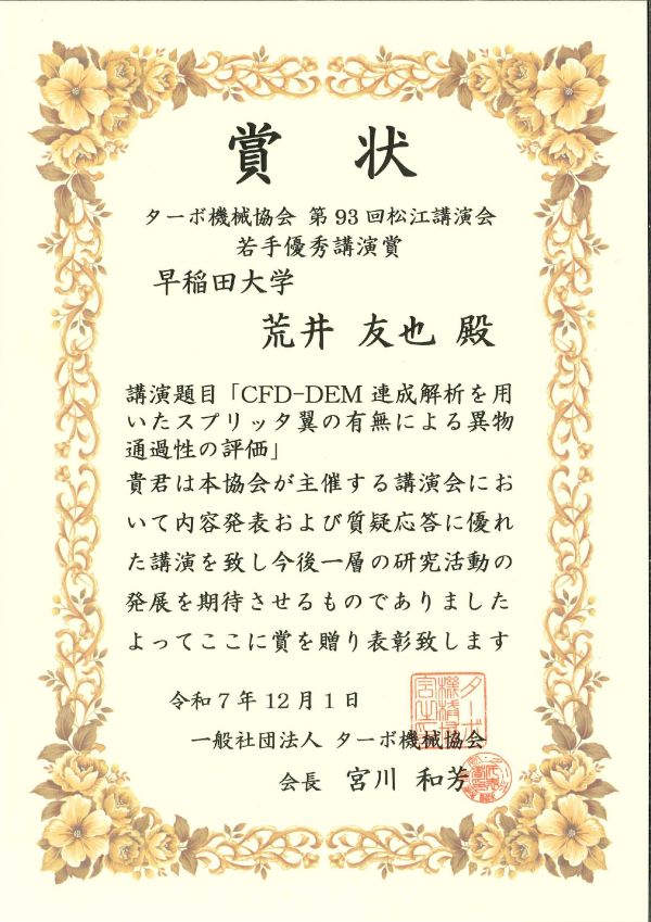 ・大貝 直輝 “小水力発電用フランシス水車向けランナの異物閉塞を抑制する形状の開発と金属積層造形を用いたランナ一体製造法の実証”
