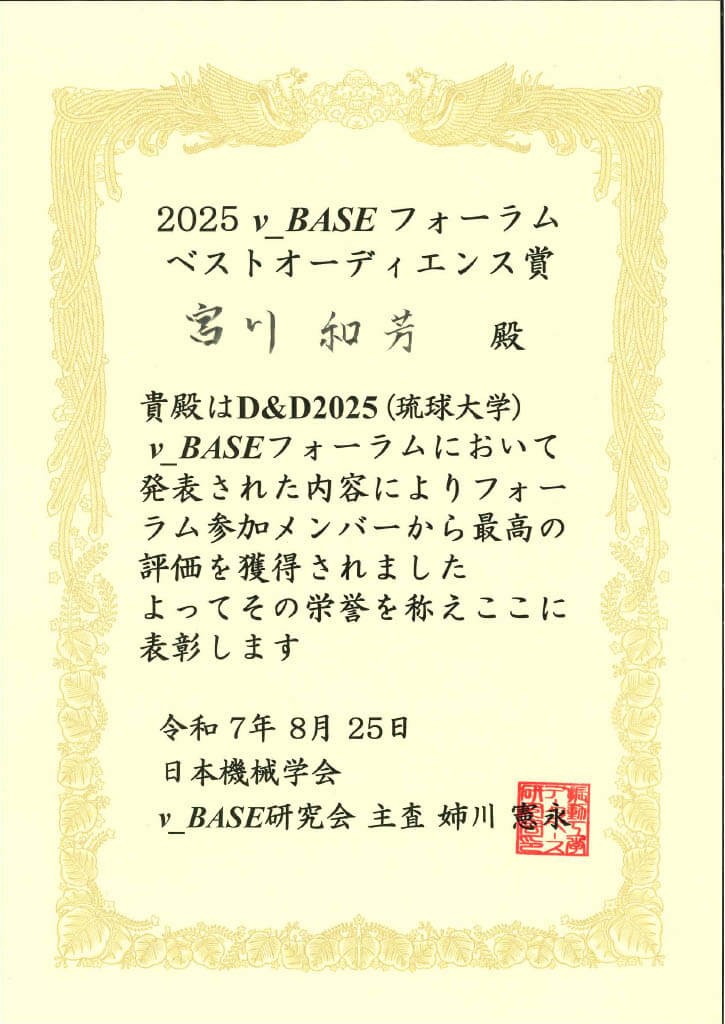 Home > News > 2025.8 日本機械学会 D&D2025において受賞 09/25/2025 2025年8月25日に琉球大学にて開催されましたD&D2025 v_BASEフォーラムにおいて宮川教授がベストオーディエンス賞を受賞しました。